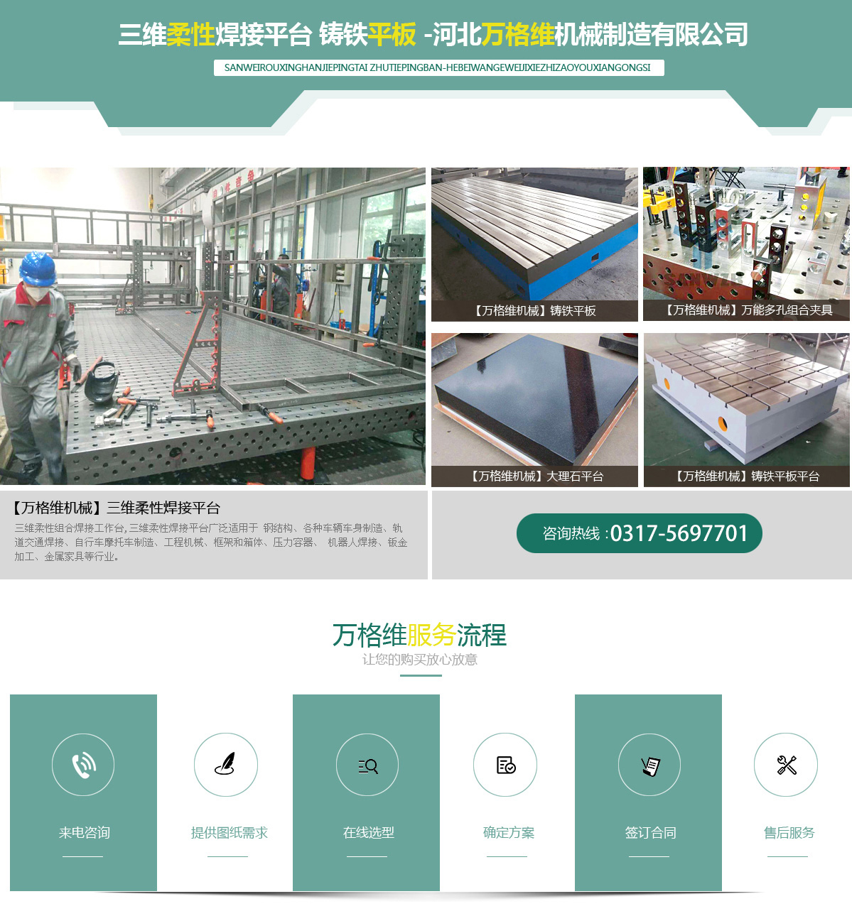 河北萬格維機械制造有限公司位于著有中國鑄造名城、中國鴨梨之鄉(xiāng)的泊頭市,東臨渤海北依京津,處于鐵路、公路、海運的樞紐地帶,交通方便,地理位置_。河北萬格維機械制造有限公司主要產(chǎn)品有: 三維柔性焊接平臺、鑄鐵平板、多孔組合夾具、檢驗平臺、基礎平臺、T型槽平板、研磨平臺、劃線平板、鉗工工作臺、大理石平臺、方箱方筒及塞規(guī)系列。